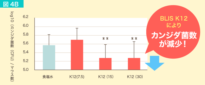 また、マウスの舌表面の菌を回収し培養の後、測定した結果、BLIS K12を15、30mg/l投与したマウスにカンジダ菌の生菌数の減少が認められ、有意差がありました。(図4B)